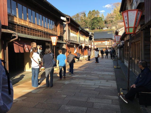 7. The Japanese eat really weird food - especially sea food. I don't mean to be disrespectful - the feeling is probably reciprocal and not to be taken personally. Many food items in the markets were unidentifiable to me especially the dried foods. Rice of course, lots of seaweed, pickled vegetables, and fish, fish, fish! And their beautiful pastries are filled with sweetened bean puree. Beans - cooked, sweetened and pureed and placed within a rice paste shell - exquisite to look at but a strange sensation to eat. I couldn't appreciate the two that I ate. At one of our hotels where we ate from the international breakfast buffet, there was an area for local foods - one of the dishes looked like a big bowl of tiny gray worms. The card below it said "white-bait". I looked it up later in the day and white bait (thereafter I saw it in dried piles at markets everywhere) are teeny tiny immature schools of fish (small fry) caught and dried whole. Dan and I stayed at an authentic Japanese inn called a Ryokan for a couple nights in the city of Kanazawa and our room included breakfast and dinner. Meals were to be served to us by one woman (who served us on her knees) in our own little closed off room with low table and cushions. I was stunned at our first dinner - nine courses and eight of those courses were fish - mostly raw accompanied by pickled veggies and seaweed. I was so stressed out during that meal because I really am not crazy about fish in general and I don't care for raw fish at all. I don't care for sushi. The dessert was a lovely looking sweet bean filled pastry that just didn't taste right. Breakfast the following morning was very similar and I truly started to cry and feel panicky because I didn't want to offend our hosts. We got out of dinner that night (we ate fried noodles and vegetable pancakes instead downtown) though we had to pay for it anyway and the second breakfast was a little more rice and egg along with fish - I did better with that one.