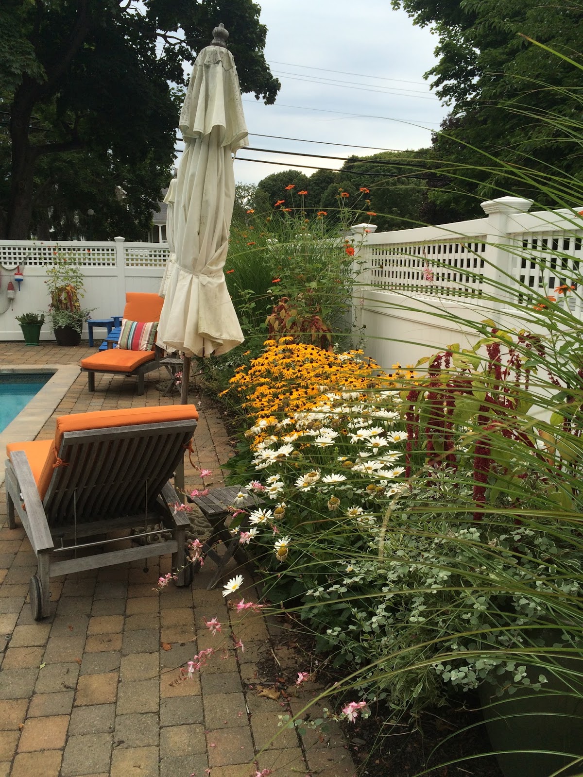 Pool area flowers above and belowWee Be Little pumpkins growing in the outer stock tank garden - the size of soft balls.